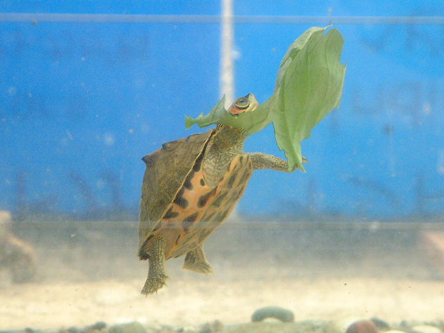 食性は植物食傾向の強い雑食で、植物の葉や茎、花、果物、水草、昆虫類、甲殻類、貝類、魚類等 を食べます。 幼体は動物食傾向が強いのですが、成長に伴い植物食傾向が強くなります。 |