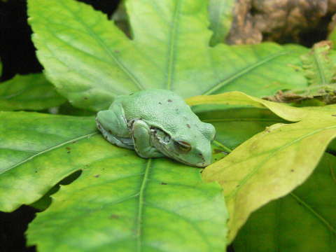 指先には丸い吸盤があり、木の上での生活に適応しています。 背中側の地色は緑ですが、地方個体群によっては全身に褐色のまだら模様が出ます。 また、体表にはつやがなく、目の虹彩が赤褐色なのも特徴です。 非繁殖期はおもに森林にすみ、湿原などで生活していますが、繁殖期の4月から7月にかけては 生息地付近の湖沼に集まり、水辺の木に登り、黄白色の泡に包まれた卵を木の枝に産み付けます。 ふ化した幼生(オタマジャクシ)は水中に落ちて育ちます。 ニホンアマガエルやシュレーゲルアオガエルと似ていますが、モリアオガエルはより大型になります。 また、ニホンアマガエルとは目から耳にかけて黒い帯模様がないこと、シュレーゲルアオガエルとは 虹彩が赤っぽいことで区別できます。 天敵はヤマカガシ、イタチ、アナグマ、タヌキなどです。 モリアオガエルは各地で生息数を減らしています。 主な理由は生息地の森林などに人の手が入り、環境が変化したことによります。 産卵のためには水面上に木の枝がせり出すような湖沼が必要ですが、 このような場所も少なくなりました。 愛知県新城市では、市のカエルとして指定を受けています。 |