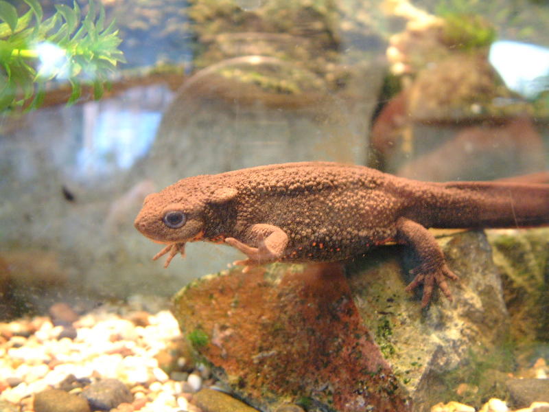 腹が赤いのでアカハライモリとも呼ばれます。 日本で単にイモリと呼ぶ場合、本種を指すことが多いです。 水田、池、川の淀みなど流れのない淡水中に生息します。 繁殖期以外は水辺の近くの林や、クズなどの茂る草地の水気の多い枯れ草の下などに潜むことが 多いです。 オスは繁殖期になると尾が紫色に変わり、メスの前でこれをS字型に曲げて細かく震わせ、 求愛行動をとります。 日本産サンショウウオ類は繁殖時期にのみ水辺に留まるものが多いですが、本種の成体は繁殖期以外も 水中で生活することが多いです。 ただし雨の日には水から出て移動することもあります。 冬は水路の落ち葉の下や水辺近くの石の下などで冬眠します。 フグと同じテトロドトキシンという毒をもち、腹の赤黒の斑点模様は毒を持つことを他の動物に知らせる 警戒色になっていると考えられています。 陸上で強い物理刺激を受けると横に倒れて体を反らせ、赤い腹を見せる動作を行います。 イモリは脊椎動物でも、特に再生能力が高いことでも知られています。 トカゲは尾を自切し、再生することで知られていますが、実は尾骨までは再生しません。 これに対して本種は尾を切ると完全に骨まで再生し、四肢を肩の関節より先で切断しても指先まで完全に 再生します。目のレンズの再生については教科書にも載るほどです。 和名の「井守」は、野井戸の中にも生息するので「井戸を守る」に由来するという説や、 井は田んぼを意味し、水田に生息することから「田を守る」との意味に由来するという説があります。 準絶滅危惧(NT)(環境省レッドリスト) |
