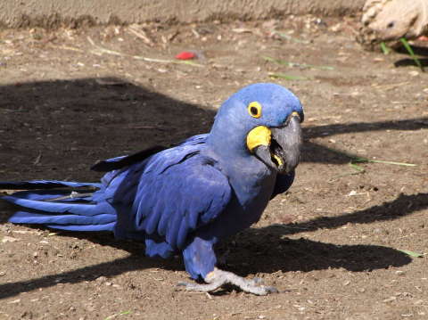 サバンナや湿原、開けた環境の周囲にある乾燥林などに生息しています。 ペアもしくは小規模な家族群を形成して生活し、渡りは行いませんが、アマゾン川流域の個体群は 季節によって長距離移動することもあります。 地面で採食し、尾羽を低く保ったまま短い足で軽快に歩きます。 全身がコバルトブルー(すみれ色)の体色をしていて、最も大きなインコです。 クチバシは大変大きく強力で、骨を砕くほどです。 ヤシの木などの樹洞や壁の岩の隙間などに巣を作ります。7〜12月に2個の卵を産み、抱卵期間は 27〜30日、育雛期間は105〜110日です。 一夫一妻で繁殖し、番(つがい)は生涯同じ相手です。 羽は青く見えますが本当は青くはなく、青の光を反射しているだけです。これを「構造色(こうぞうしょく)」 といいます。羽は裏から見ると真っ黒です。 農業や牧畜による生息地の破壊、羽毛用や食用、ペット用の乱獲などにより生息数は激減しています。 ブラジルでは法的に保護の対象とされており、巣箱の設置、エコツーリズムなどの保護対策が進められて います。1997年におけるパンタナルでの生息数は5,000羽以下、マンガベイラス山地での生息数は 1,000〜2,500羽と推定されています。 1987年にワシントン条約附属書Iに掲載されました。 絶滅危惧種(IUCN レッドリスト 絶滅危惧種 EN)です。 寿命は30〜35年です。 |